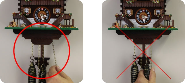 2. Important: Do not pull on the weights directly, as this can damage the clock's gears.