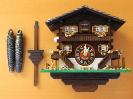 Carefully unpack the cuckoo clock along with its accessories, pendulum, and weights.