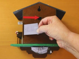 Unlatch the cuckoo bird's door by moving the wire to the side. If it remains latched, the cuckoo will not come out.